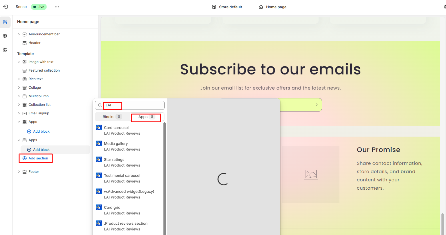 - Add to Any Page: In the Shopify theme editor, click Add section → select Apps → search for “LAI”. A list of available LAI widgets will appear. Choose the widget that best fits your needs and add it to the page.
