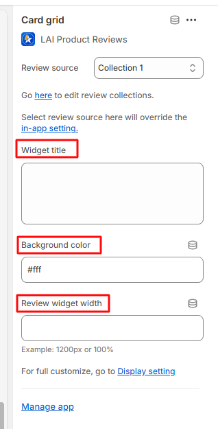 - In Shopify Theme editor: Each widget has its own default settings for colors, weight, etc., but you can customize two elements which are Background color and Review widget width right on: