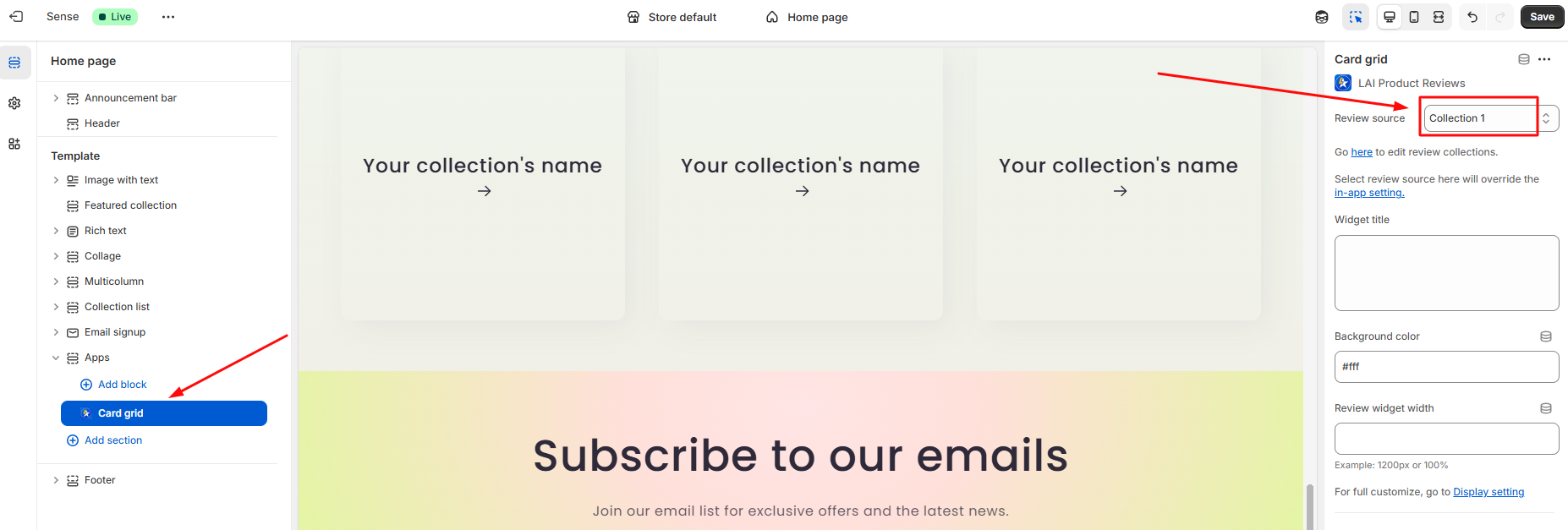 1. Select a review source (collections/current product page)